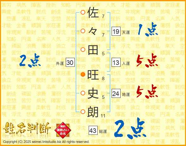 佐(7画)々(7画)田(5画) 旺(8画)史(5画)朗(11画)