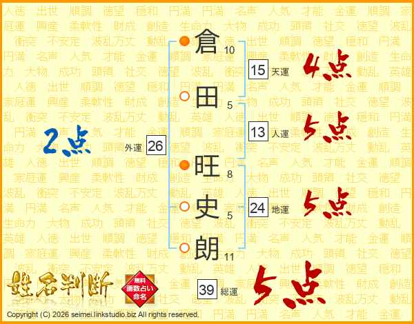 倉田旺史朗さんの総運は39画の5点!