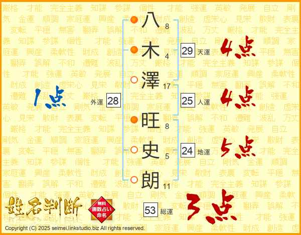 八(8画)木(4画)澤(17画) 旺(8画)史(5画)朗(11画)
