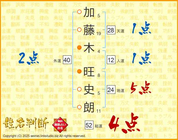 加(5画)藤(19画)木(4画) 旺(8画)史(5画)朗(11画)
