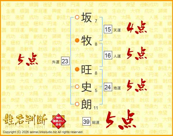 坂(7画)牧(8画) 旺(8画)史(5画)朗(11画)