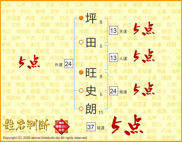 坪(8画)田(5画) 旺(8画)史(5画)朗(11画)