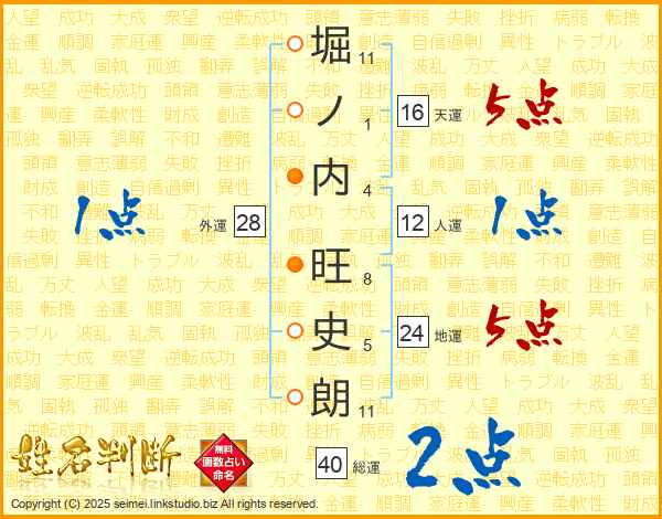 堀(11画)ノ(1画)内(4画) 旺(8画)史(5画)朗(11画)