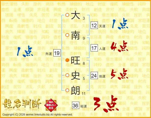 大(3画)南(9画) 旺(8画)史(5画)朗(11画)