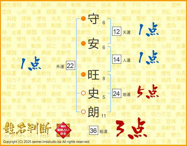 守(6画)安(6画) 旺(8画)史(5画)朗(11画)
