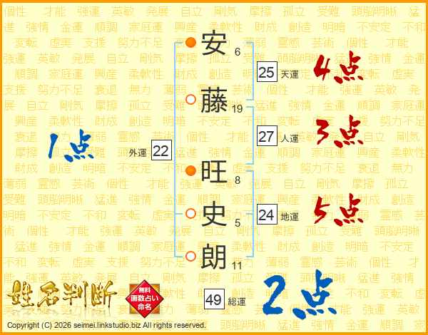 安(6画)藤(19画) 旺(8画)史(5画)朗(11画)