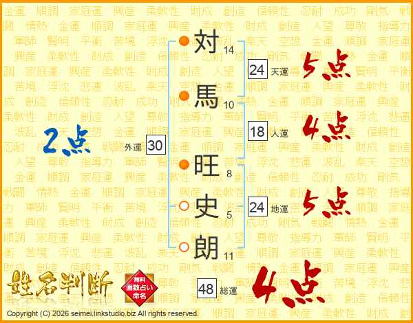対(14画)馬(10画) 旺(8画)史(5画)朗(11画)