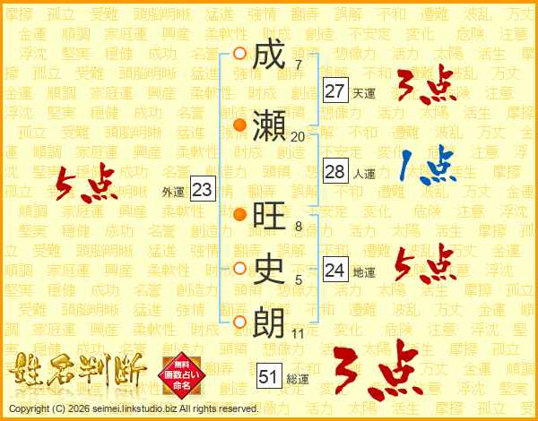成(7画)瀬(20画) 旺(8画)史(5画)朗(11画)