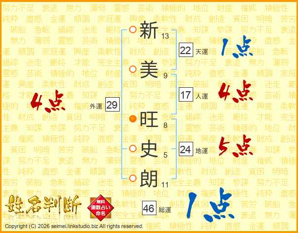 新(13画)美(9画) 旺(8画)史(5画)朗(11画)