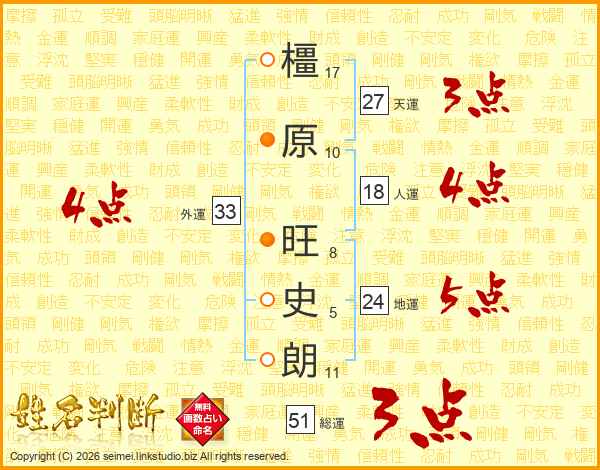 橿(17画)原(10画) 旺(8画)史(5画)朗(11画)