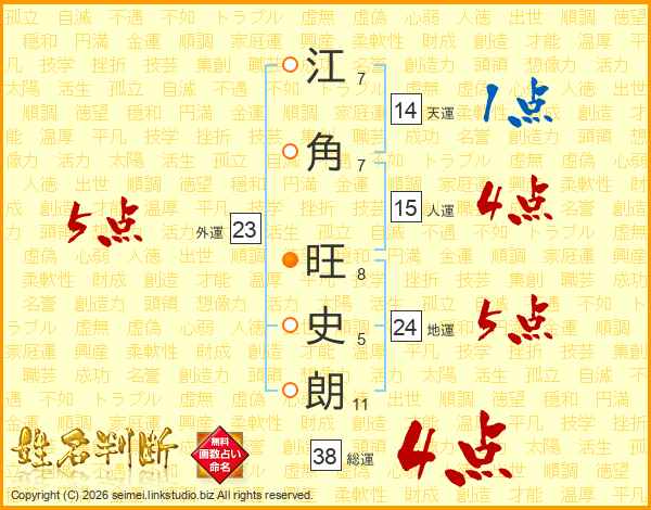 江(7画)角(7画) 旺(8画)史(5画)朗(11画)