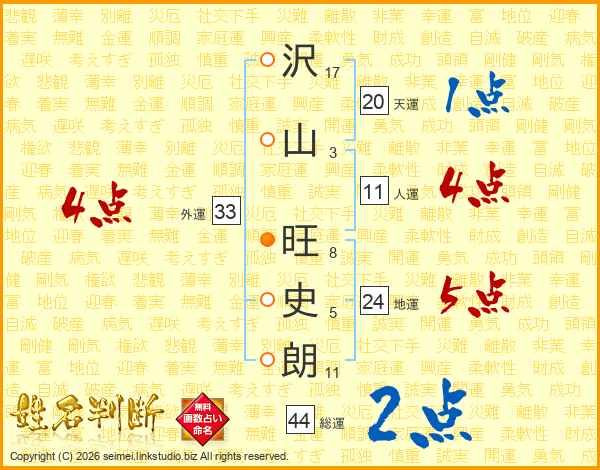 沢(17画)山(3画) 旺(8画)史(5画)朗(11画)