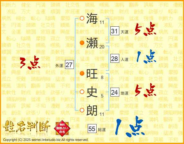 海(11画)瀬(20画) 旺(8画)史(5画)朗(11画)