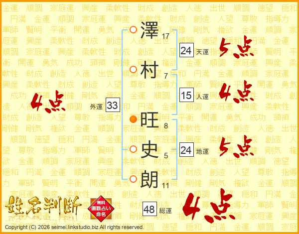 澤(17画)村(7画) 旺(8画)史(5画)朗(11画)