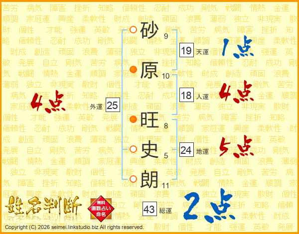 砂(9画)原(10画) 旺(8画)史(5画)朗(11画)
