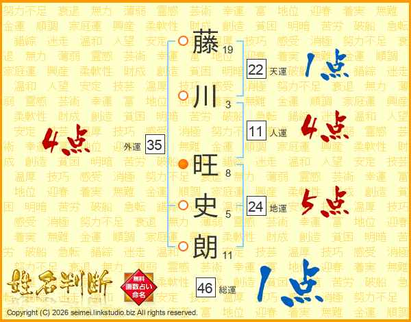 藤(19画)川(3画) 旺(8画)史(5画)朗(11画)