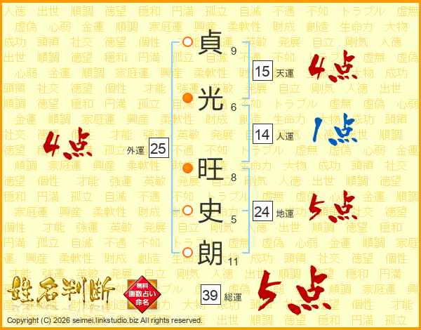 貞(9画)光(6画) 旺(8画)史(5画)朗(11画)
