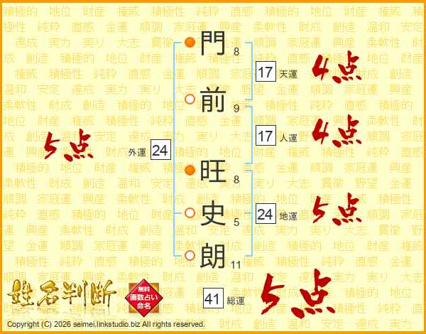 門(8画)前(9画) 旺(8画)史(5画)朗(11画)