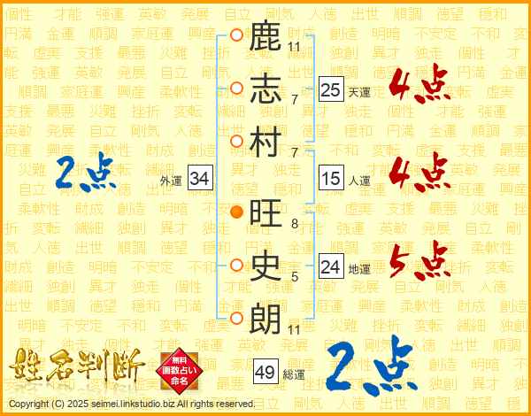 鹿(11画)志(7画)村(7画) 旺(8画)史(5画)朗(11画)