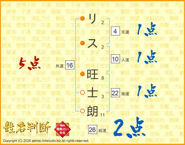 リ(2画)ス(2画) 旺(8画)士(3画)朗(11画)