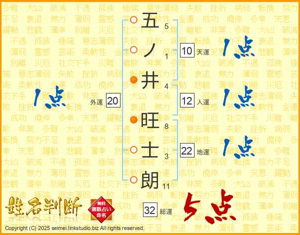 五(5画)ノ(1画)井(4画) 旺(8画)士(3画)朗(11画)