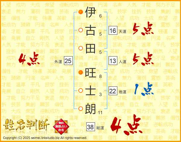 伊(6画)古(5画)田(5画) 旺(8画)士(3画)朗(11画)