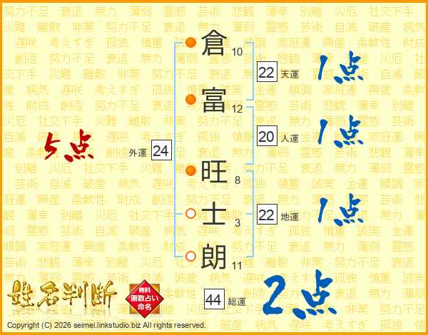 倉(10画)富(12画) 旺(8画)士(3画)朗(11画)