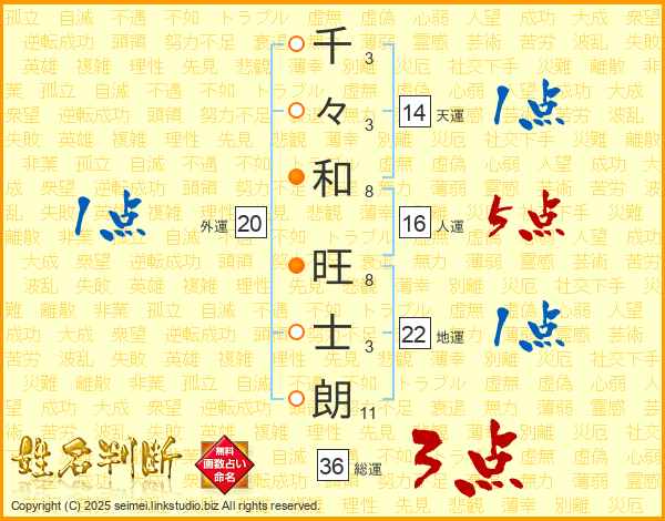 千(3画)々(3画)和(8画) 旺(8画)士(3画)朗(11画)