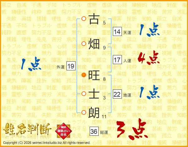 古(5画)畑(9画) 旺(8画)士(3画)朗(11画)