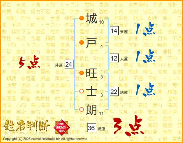 城(10画)戸(4画) 旺(8画)士(3画)朗(11画)