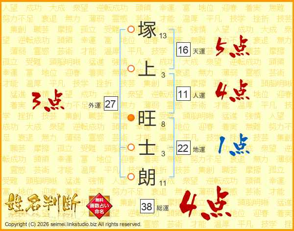 塚(13画)上(3画) 旺(8画)士(3画)朗(11画)