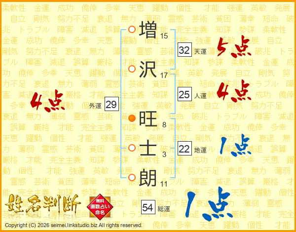 増(15画)沢(17画) 旺(8画)士(3画)朗(11画)