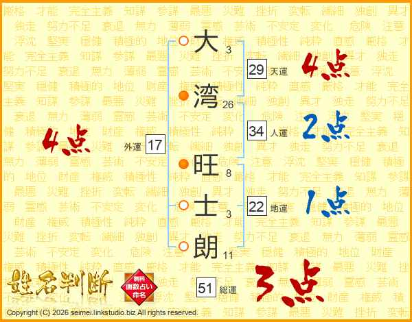 大(3画)湾(26画) 旺(8画)士(3画)朗(11画)
