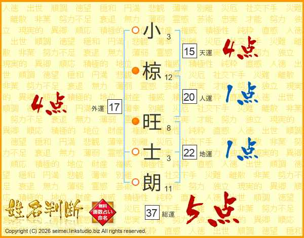 小(3画)椋(12画) 旺(8画)士(3画)朗(11画)