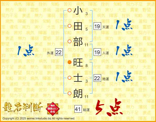 小(3画)田(5画)部(11画) 旺(8画)士(3画)朗(11画)