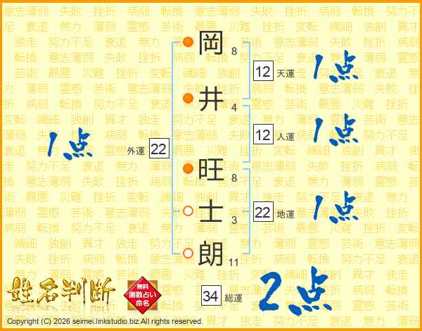 岡(8画)井(4画) 旺(8画)士(3画)朗(11画)