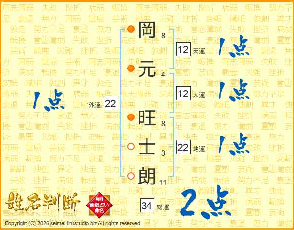 岡(8画)元(4画) 旺(8画)士(3画)朗(11画)