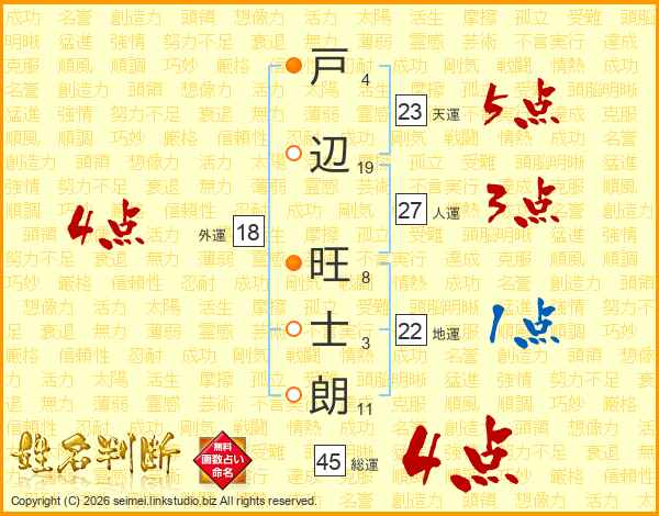 戸(4画)辺(19画) 旺(8画)士(3画)朗(11画)