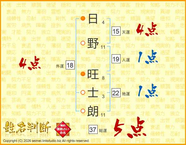 日(4画)野(11画) 旺(8画)士(3画)朗(11画)