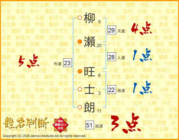 柳(9画)瀬(20画) 旺(8画)士(3画)朗(11画)