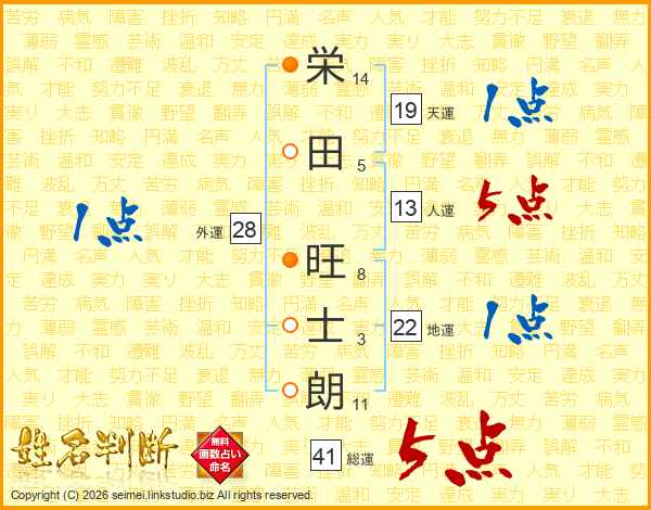 栄(14画)田(5画) 旺(8画)士(3画)朗(11画)