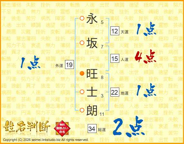 永(5画)坂(7画) 旺(8画)士(3画)朗(11画)