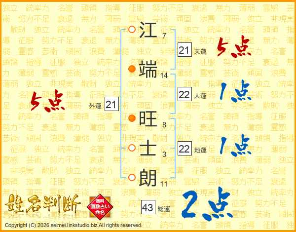 江(7画)端(14画) 旺(8画)士(3画)朗(11画)