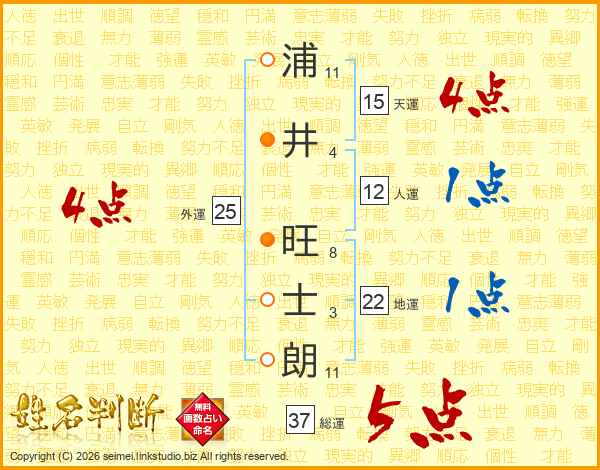 浦(11画)井(4画) 旺(8画)士(3画)朗(11画)