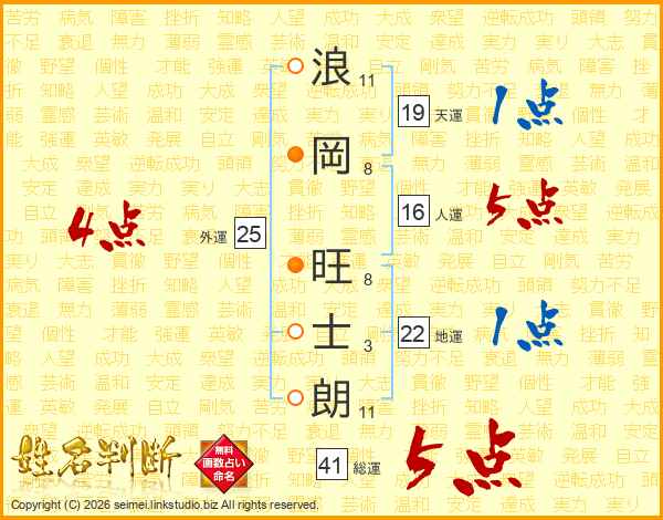浪(11画)岡(8画) 旺(8画)士(3画)朗(11画)