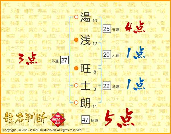 湯(13画)浅(12画) 旺(8画)士(3画)朗(11画)