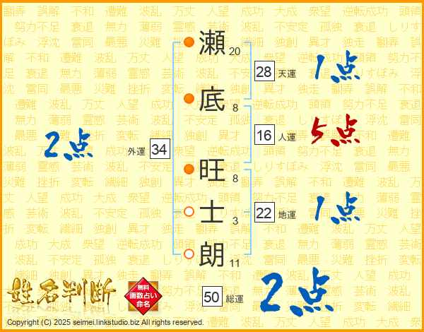 瀬(20画)底(8画) 旺(8画)士(3画)朗(11画)