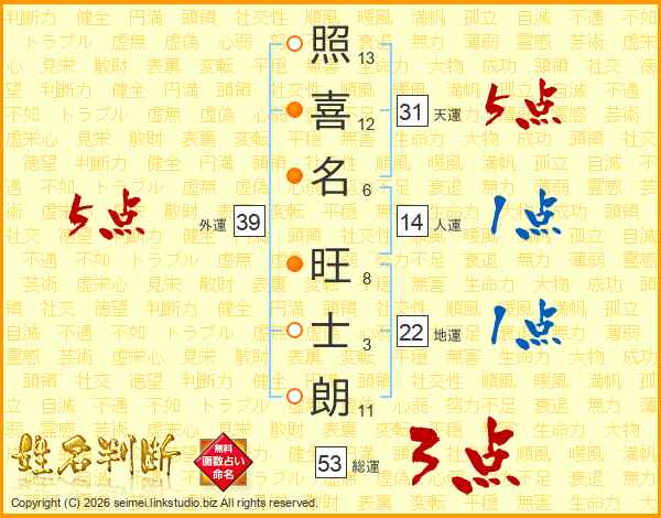 照(13画)喜(12画)名(6画) 旺(8画)士(3画)朗(11画)