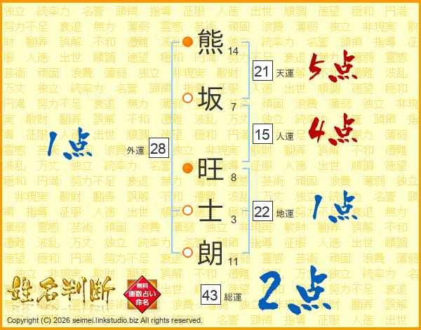 熊坂旺士朗さんの天運は21画の5点!
