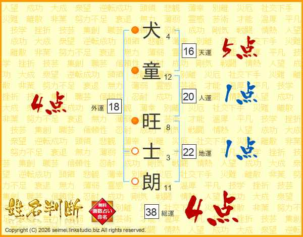 犬(4画)童(12画) 旺(8画)士(3画)朗(11画)